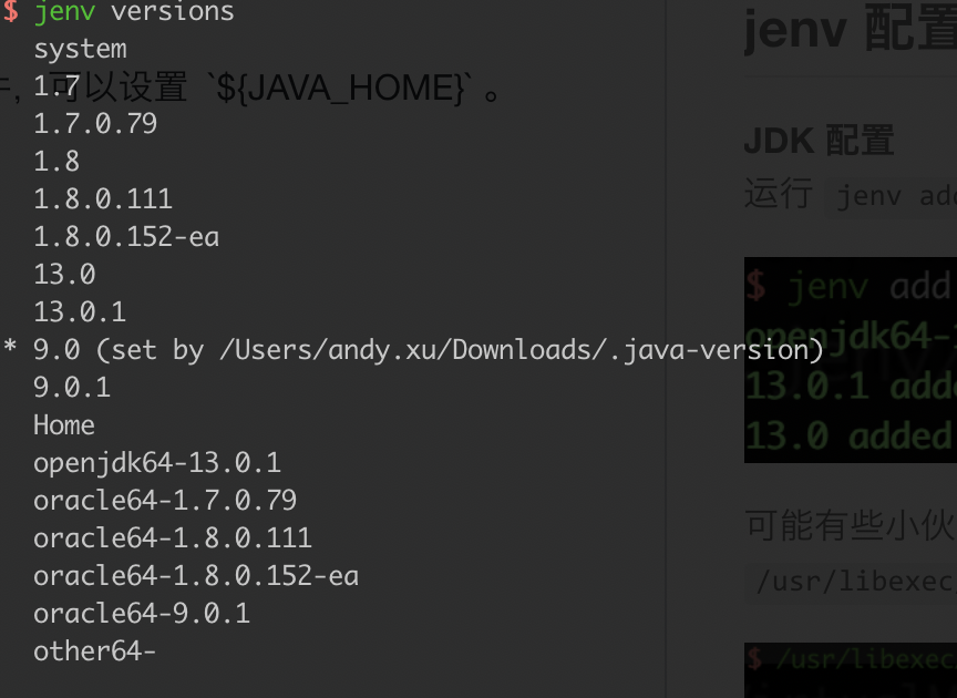 上面几个是 jenv 经常使用的指令,若想了解 jenv 其他指令,可以通过 jenv commands 查找其他指令。