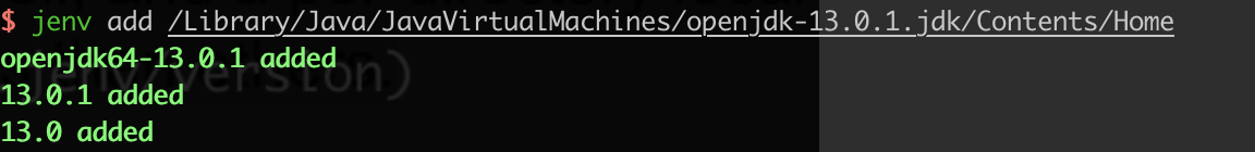 echo 'export PATH="$HOME/.jenv/bin:$PATH"' >> ~/.zshrc echo 'eval "$(jenv init -)"' >> ~/.zshrc source ~/.zshrc