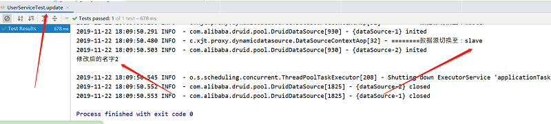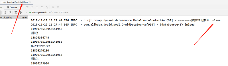 @RunWith(SpringRunner.class) @SpringBootTest class UserServiceTest { @Autowired UserService userService; @Test void listUser() { List<User> users = userService.listUser(); for (User user : users) { System.out.println(user.getUserId()); System.out.println(user.getUserName()); System.out.println(user.getUserPhone()); } } @Test void update() { userService.update(); User user = userService.find(); System.out.println(user.getUserName()); } }
