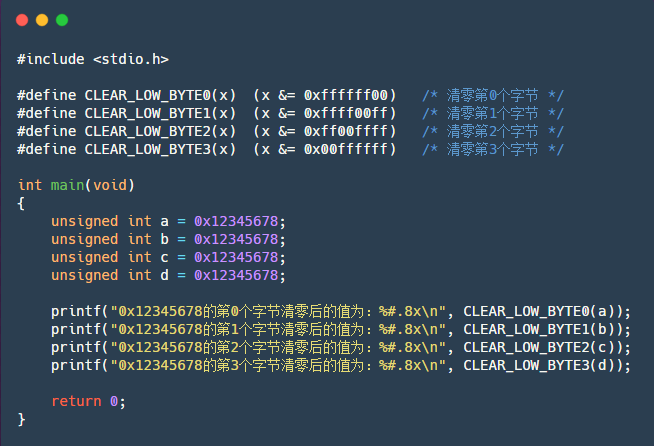 #define CLEAR_LOW_BYTE0(x) (x &= 0xffffff00) /* 清零第0个字节 */ #define CLEAR_LOW_BYTE1(x) (x &= 0xffff00ff) /* 清零第1个字节 */ #define CLEAR_LOW_BYTE2(x) (x &= 0xff00ffff) /* 清零第2个字节 */ #define CLEAR_LOW_BYTE3(x) (x &= 0x00ffffff) /* 清零第3个字节 */