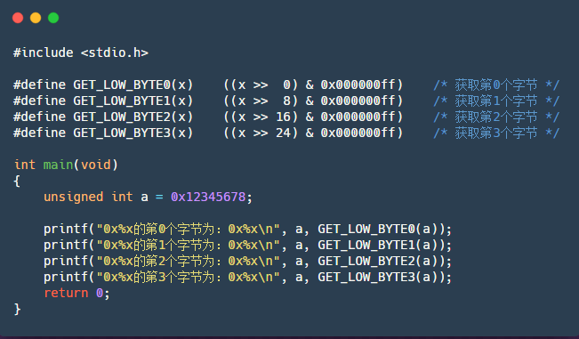 #define GET_LOW_BYTE0(x) ((x >> 0) & 0x000000ff) /* 获取第0个字节 */ #define GET_LOW_BYTE1(x) ((x >> 8) & 0x000000ff) /* 获取第1个字节 */ #define GET_LOW_BYTE2(x) ((x >> 16) & 0x000000ff) /* 获取第2个字节 */ #define GET_LOW_BYTE3(x) ((x >> 24) & 0x000000ff) /* 获取第3个字节 */