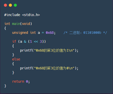 也就是说,要判断第几位的值,if里就左移几位(当然别过头了)。在嵌入式编程中,可通过这样的方式来判断寄存器的状态位是否被置位。