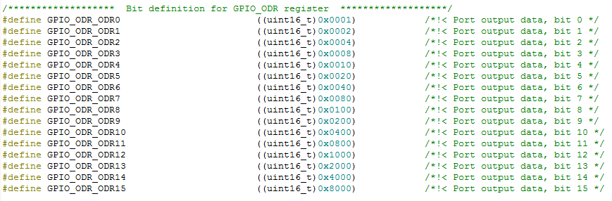 GPIOA->ODR |= GPIO_ODR_ODR10; /* PA10输出高(置1操作) */ GPIOA->ODR &= ~GPIO_ODR_ODR10; /* PA10输出低(清0操作) */