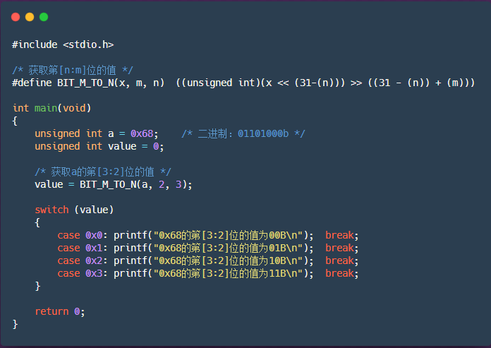 /* 获取第[n:m]位的值 */ #define BIT_M_TO_N(x, m, n) ((unsigned int)(x << (31-(n))) >> ((31 - (n)) + (m)))