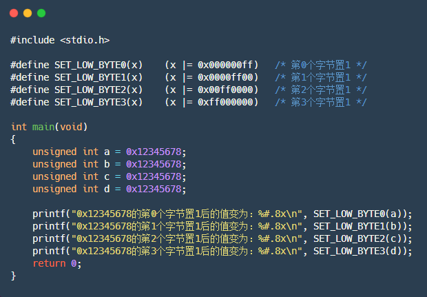 #define SET_LOW_BYTE0(x) (x |= 0x000000ff) /* 第0个字节置1 */ #define SET_LOW_BYTE1(x) (x |= 0x0000ff00) /* 第1个字节置1 */ #define SET_LOW_BYTE2(x) (x |= 0x00ff0000) /* 第2个字节置1 */ #define SET_LOW_BYTE3(x) (x |= 0xff000000) /* 第3个字节置1 */