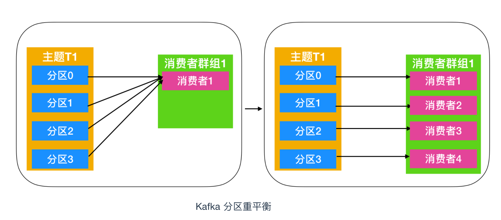 重平衡:Rebalance。消费者组内某个消费者实例挂掉后,其他消费者实例自动重新分配订阅主题分区的过程。Rebalance 是 Kafka 消费者端实现高可用的重要手段。