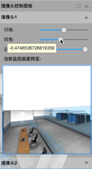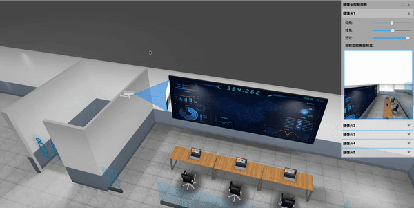 在控制面板中可以调整摄像头的方向,摄像头监控的辐射范围,摄像头前方锥体的长度等等,并且摄像头的图像是实时生成,以下为运行截图:
