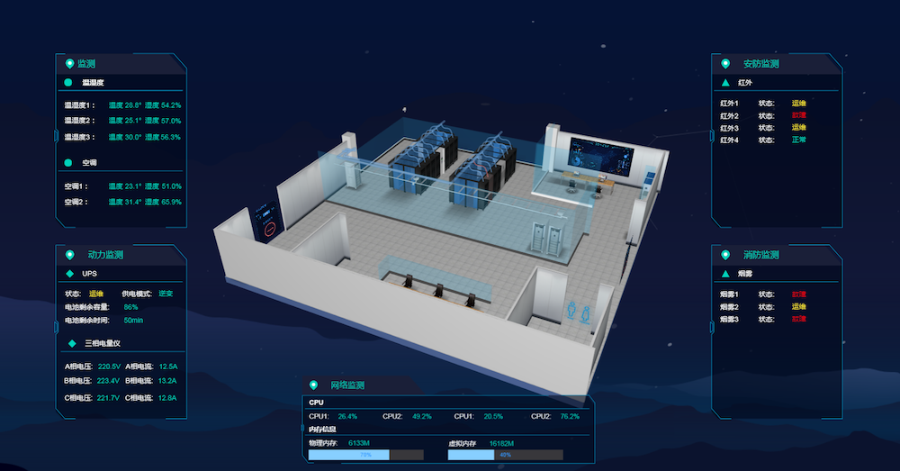 在 3D 机房数据中心可视化应用中,随着视频监控联网系统的不断普及和发展, 网络摄像机更多的应用于监控系统中,尤其是高清时代的来临,更加快了网络摄像机的发展和应用。