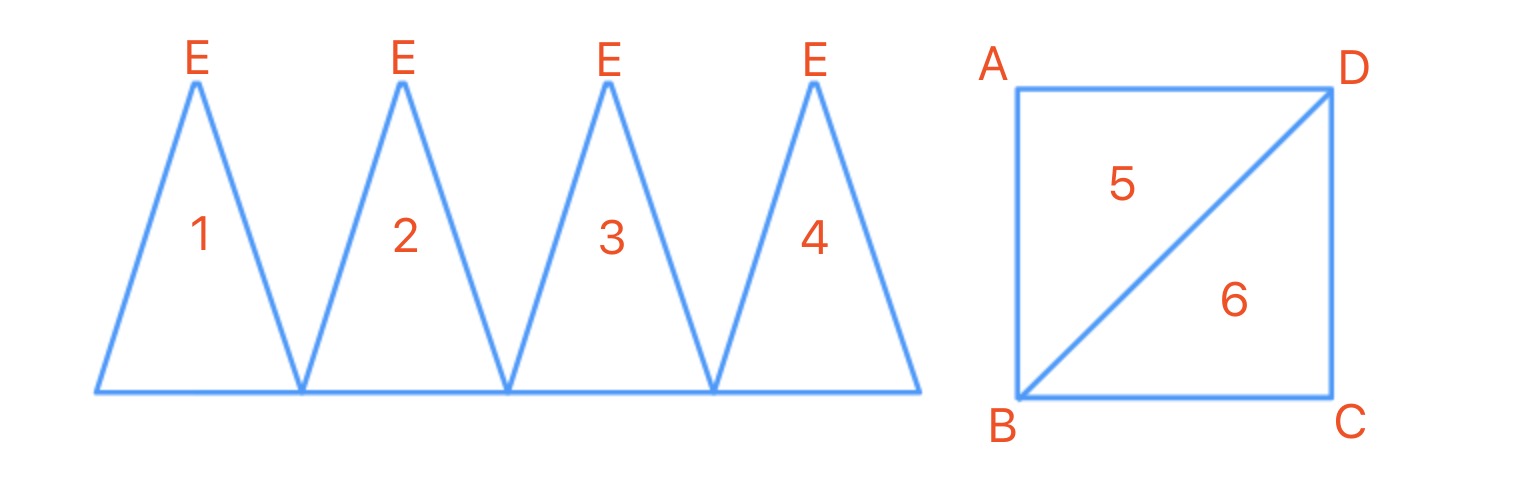 HT 中通过 ht.Default.setShape3dModel(name, model) 函数,可注册自定义 3D 模型,摄像头前方生成的锥体便是通过该方法生成。可以将该锥体看成由 5 个顶点,6 个三角形组成,具体图如下: