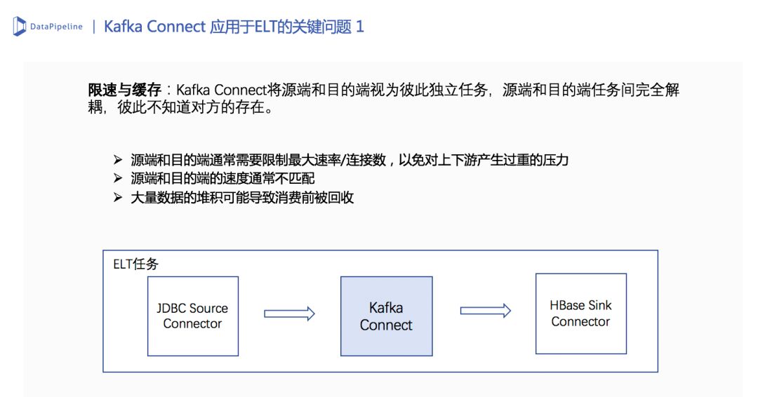首先是 任务的限速和数据缓存问题。从 Kafka Connect 设计之初,就遵从从源端到目的地解耦性。当 Source 的写入速度长时间大于 Sink 端的消费速度时,就会产生 Kafka 队列中消息的堆积。如果 Kafka 的 Topic Retention 参数设置不当,有可能会造成数据在消费前被回收,造成数据丢失。Kafka Connect 框架本身并没有提供 Connector 级别的限速措施,需要进行二次开发。