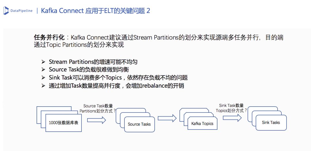 当用户有多个数据源,或者单一数据源中有大量的表需要进行并行同步时,任务的并行化问题 就产生了。Kafka Connect 的 rebalance 是牵一发动全身,一个新任务的开始和停止都会导致所有任务的 reload。当任务数很多的时候,整个 Kafka Connect 集群可能陷入长达数分钟的 rebalance 过程。