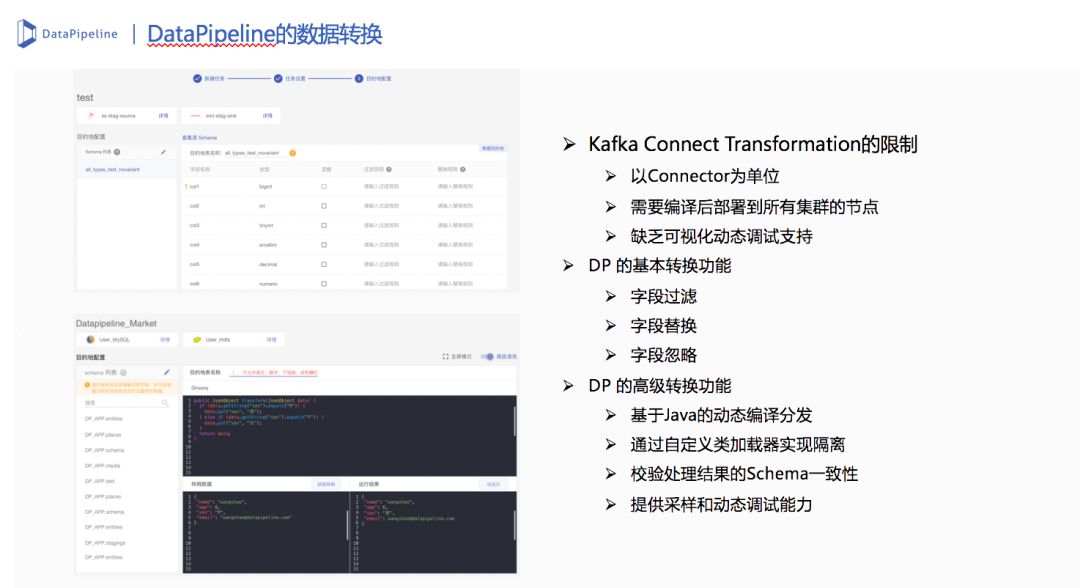 DataPipeline 实现了自己的 动态加载机制。提供了两种 可视化的转换器:基本转换器和高级转换器。前者提供包括字段过滤、字段替换和字段忽略等功能;后者基于 Java,可以更加灵活地对数据处理,并且校验处理结果的 Schema 一致性。DataPipeline 还提供了数据采样和动态调试能力,方便用户进行表级别的转换规则开发。