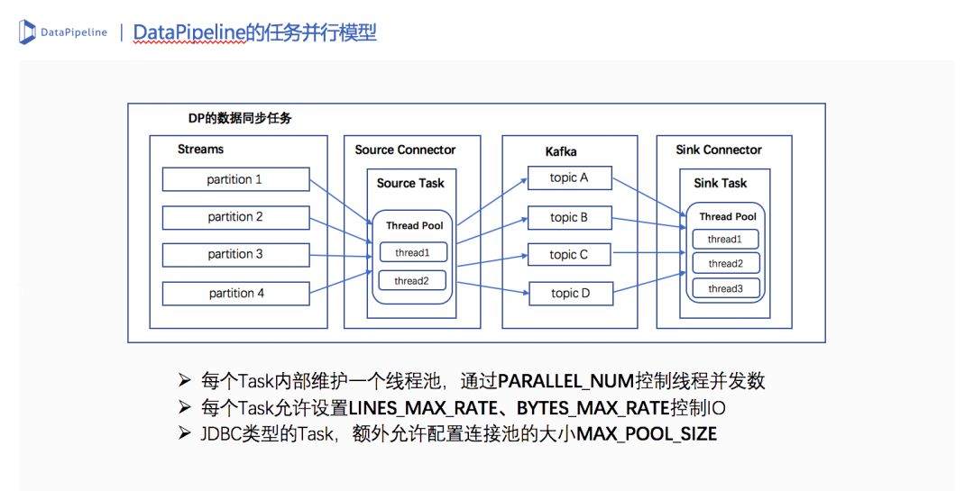 DataPipeline 在任务并行方面做了一些加强。在 DataPipeline Connector 中,我们在每个 Task 内部定义和维护一个线程池,从而能够用较少的 Task 数量达到比较高的并行度,降低了 rebalance 的开销。 而对于 JDBC 类型的 Connector,我们额外允许配置连接池的大小,减少上游和下游资源的开销。此外,每个 Connector 还可以定义自己限速策略,以适应不同的应用环境需求。