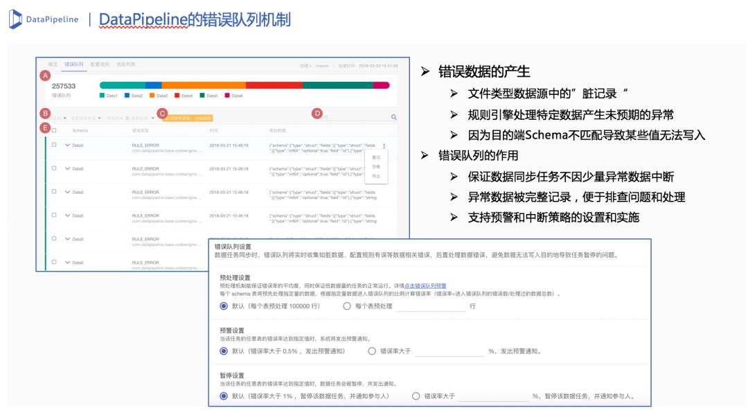通过产品中错误队列预警功能,用户可以指定面对错误数据暂存和处理逻辑,比如错误队列达到某个百分比的时候任务会暂停,这样的设置可以保证任务不会因少量异常数据而中断,被完整记录下来的异常数据可以被管理员非常方便地进行追踪、排查和处理。