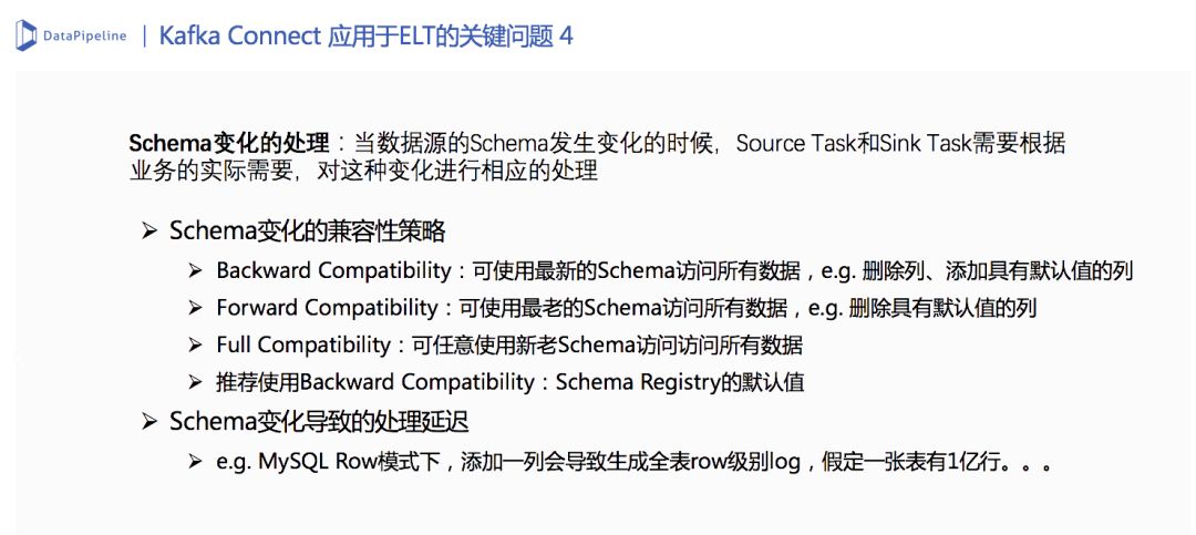 可用于构建 ELT 的开源数据集成平台方案不止一种,较广泛采用的包括 Kafka Connect、DataX 等,也有公司直接采用 Flink 等流式计算框架。DataPipeline 作为一家提供企业数据集成产品的公司,我们在 Kafka Connect 之上踩了许多坑并且也做了许多优化。