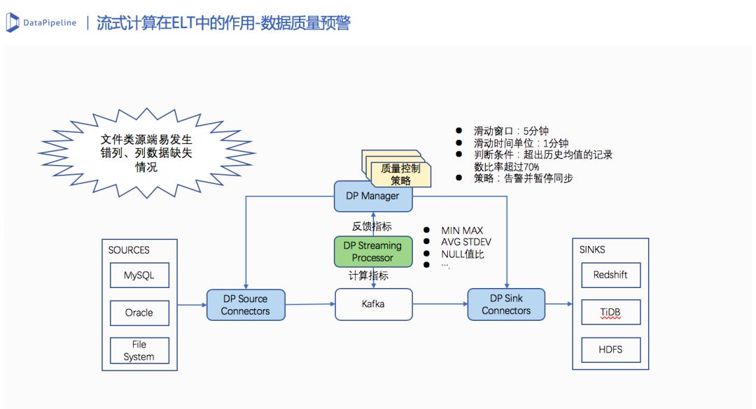 DataPipeline 也将流式计算引入到平台的质量预警功能中。在我们的未来版本中,用户可以定义 Topic 级别的质量预警规则模型,例如“在 5 分钟时间内,数据记录的字段 1 均值超过历史均值记录的比率超过 70%”为异常,采取策略为“告警并暂停同步”。通过这种方式,可以在 ELT 的过程中,尽早发现数据中的异常现象,避免大量异常数据进入数据目的地。