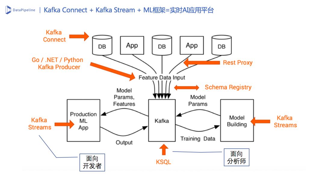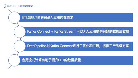 Kafka Connect 本身是一个业界被广泛采用的 ELT 框架,针对容错、分布式、Schema 一致性等方面都提供了良好的支持,同时有大量的社区和商业资源可供参考和选择。DataPipeline 基于 Kafka Connect 做了大量数据集成场景下的优化,与 Kafka Stream 相结合,能够为包括 AI 在内的各种应用场景构建起一个完整的数据层支撑方案。