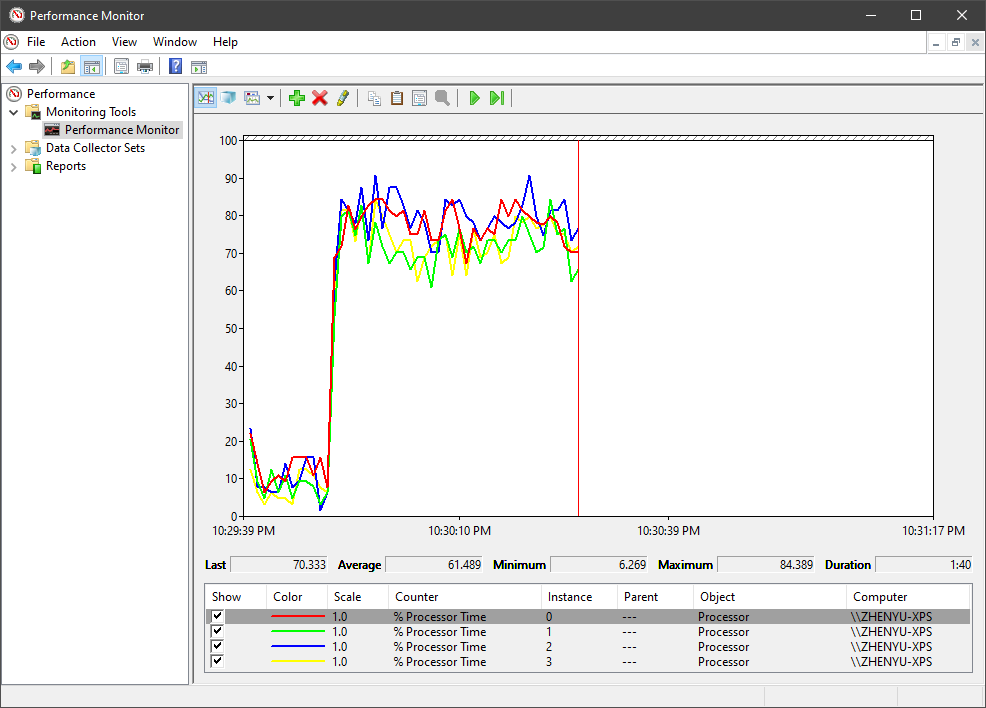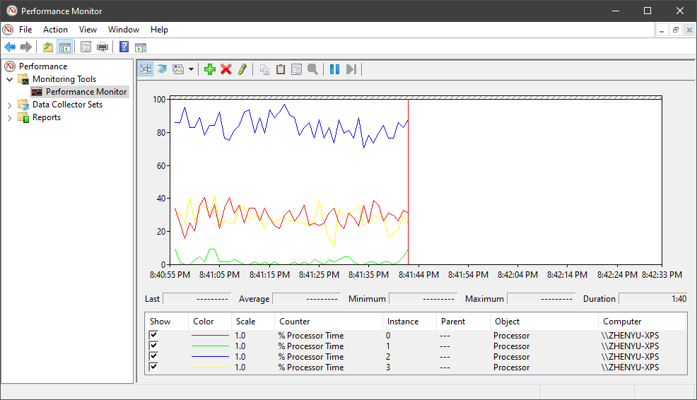 可以看到,非常简单的一段代码,当我用Windows的性能监测工具来监测每个处理器的使用率时,发现了一个有趣的现象.