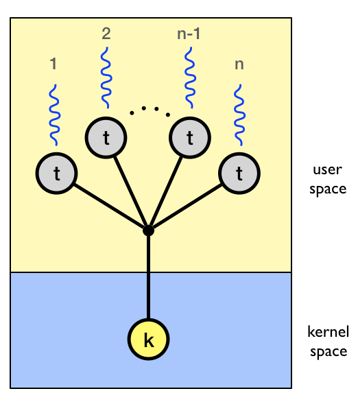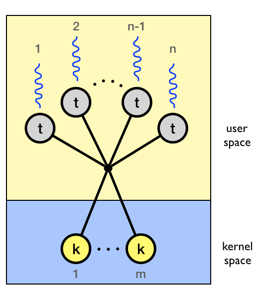 在多对多模型中,m个内核线程处理n个用户线程,其中m < n. 该模型并发性最好,并且不用创建过多的内核线程,涉及到的线程切换同步的开销也更小.