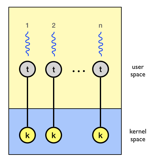 在这种模型下用户级线程与内核级线程之间存在一对一的关系。该模型比多对一模型并发性好,当一个线程进行阻塞系统调用时,它还允许另一个线程运行,所以它支持多个线程以在处理器上并行执行。