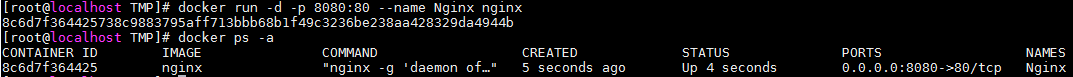 docker run -d -p 8080:80 --name Nginx nginx # 参数详解见下文