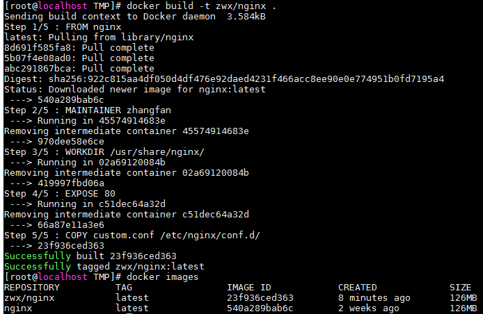 docker build -t zwx/nginx . # 后面有个点,代表当前目录下dockerfile文件