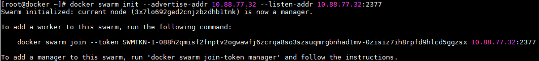 docker swarm init # 默认初始化节点为管理节点--advertise-addr xx.xx.xx.xx #指定使用的ip--listen-addr xx.xx.xx.xx:2377 #指定监听ip和port,默认为2377