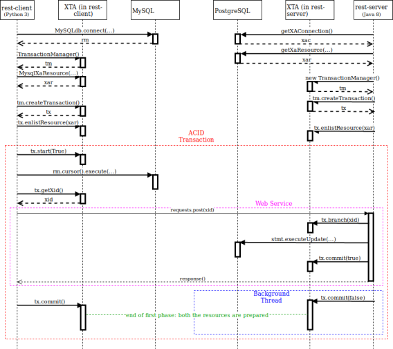 1 # initialize XTA environment 2 3 Xta_init() 4 5 # create a new MySQL connection 6 7 # Note: using MySQLdb functions 8 9 rm = MySQLdb.connect(host=hostname, user="lixa", password="passw0rd", db="lixa")10 11 # create a new XTA Transaction Manager object12 13 tm = TransactionManager()14 15 # create an XA resource for MySQL16 17 # second parameter "MySQL" is descriptive18 19 # third parameter "localhost,0,lixa,,lixa" identifies the specific database20 21 xar = MysqlXaResource(rm._get_native_connection(), "MySQL",22 23 hostname + "/lixa")24 25 # Create a new XA global transaction and retrieve a reference from26 27 # the TransactionManager object28 29 tx = tm.createTransaction()30 31 # Enlist MySQL resource to transaction32 33 tx.enlistResource(xar)34 35 sys.stdout.write("***** REST client *****n")36 37 # Start a new XA global transaction with multiple branches38 39 tx.start(True)40 41 # Execute DELETE statement42 43 sys.stdout.write("MySQL: executing SQL statement >" + delete_stmt + "<n")44 45 cur = rm.cursor()46 47 cur.execute(delete_stmt)48 49 # Retrieving xid50 51 xid = tx.getXid().toString()52 53 # Calling server passing xid54 55 sys.stdout.write("Calling REST service passing: xid='" + xid + "', oper='delete'n")56 57 r = requests.post("http://" + hostname + ":18080/xta/myresource",58 59 data={'xid':xid, 'oper':'delete'})60 61 sys.stdout.write("Server replied >" + r.text + "<n")62 63 # Commit the transaction64 65 sys.stdout.write("Executing transaction commitn")66 67 tx.commit()