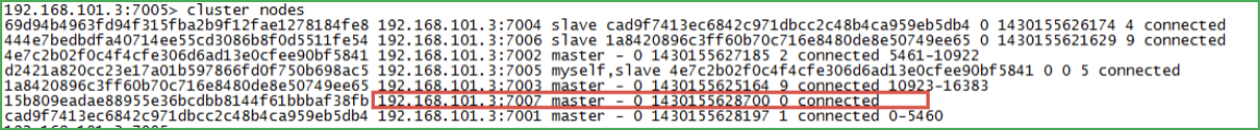 127.0.0.1:7003> cluster nodes 7a12bc730ddc939c84a156f276c446c28acf798c 127.0.0.1:7002 master - 0 1443601739754 2 connected 5461-10922 93f73d2424a796657948c660928b71edd3db881f 127.0.0.1:7003 myself,master - 0 0 3 connected 10923-16383 d8f6a0e3192c905f0aad411946f3ef9305350420 127.0.0.1:7001 master - 0 1443601741267 1 connected 0-5460 4170a68ba6b7757e914056e2857bb84c5e10950e 127.0.0.1:7006 slave 93f73d2424a796657948c660928b71edd3db881f 0 1443601739250 6 connected f79802d3da6b58ef6f9f30c903db7b2f79664e61 127.0.0.1:7004 slave d8f6a0e3192c905f0aad411946f3ef9305350420 0 1443601742277 4 connected 0bc78702413eb88eb6d7982833a6e040c6af05be 127.0.0.1:7005 slave 7a12bc730ddc939c84a156f276c446c28acf798c 0 1443601740259 5 connected 127.0.0.1:7003>