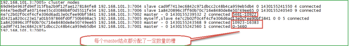 redis集群有16384个槽,集群中的每个节点分配自己槽,通过查看集群节点可以看到槽占用情况。