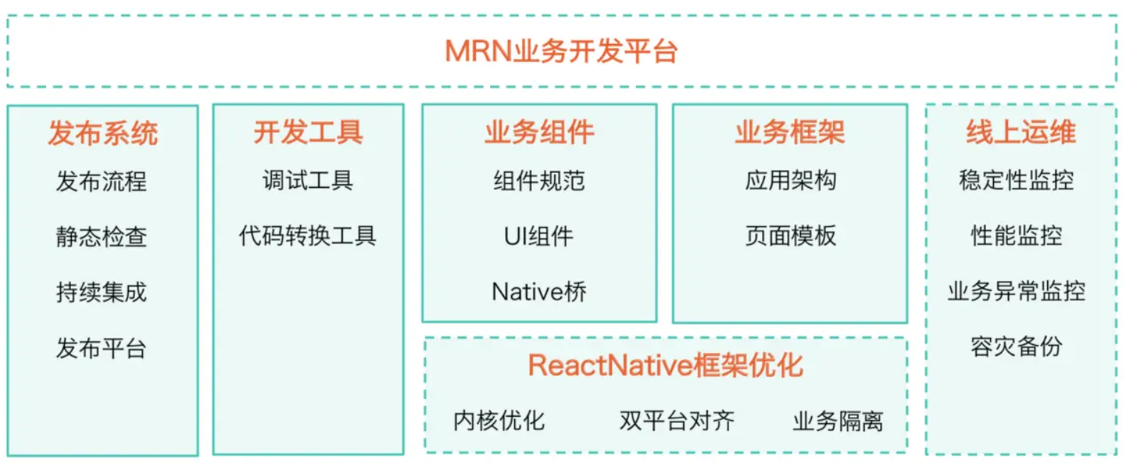 MRN-Meituan Reative Native,顾名思义可以知道这是美团基于RN框架进行封装优化的一个跨端动态化框架,下图可以看到MRN的整个周边设施建设: