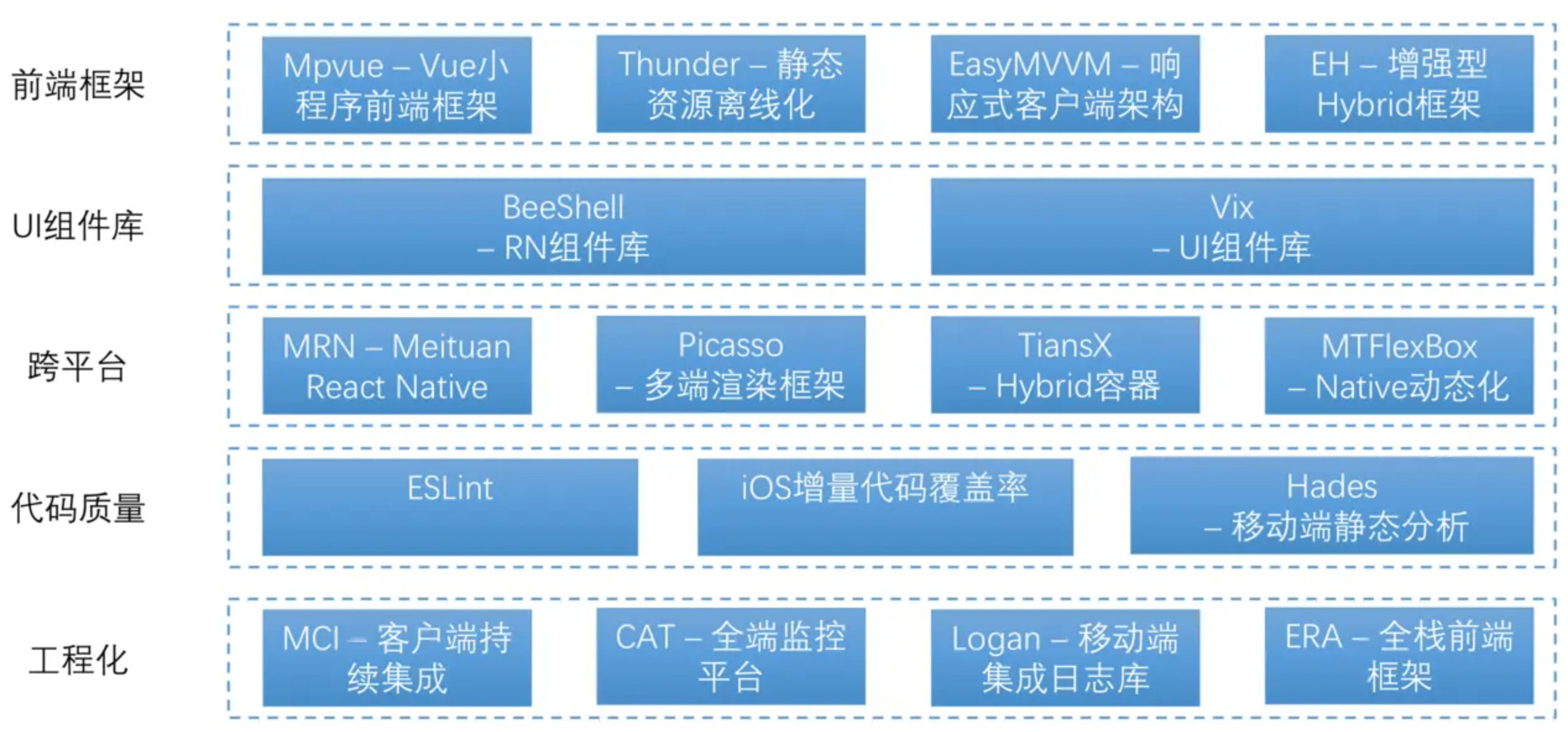 美团点评是一个多业务形态的平台,各个业务发展阶段和技术诉求都不尽相同,因此前端技术在美团点评各个团队中百花齐放,诞生了众多的解决方案。下面我分享一下几个代表性团队的前端技术体系。