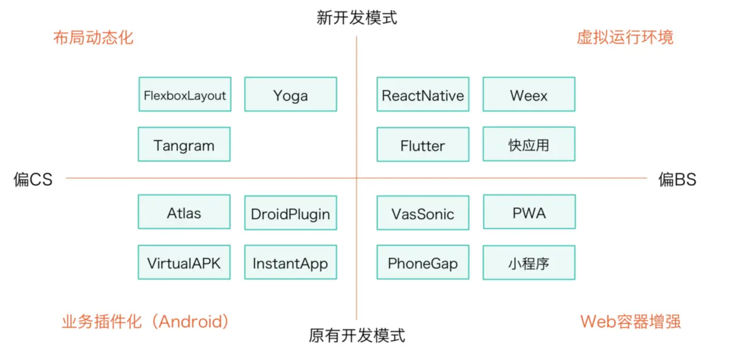 将业界主流的跨平台方案整理一下,大致分为四个类别: