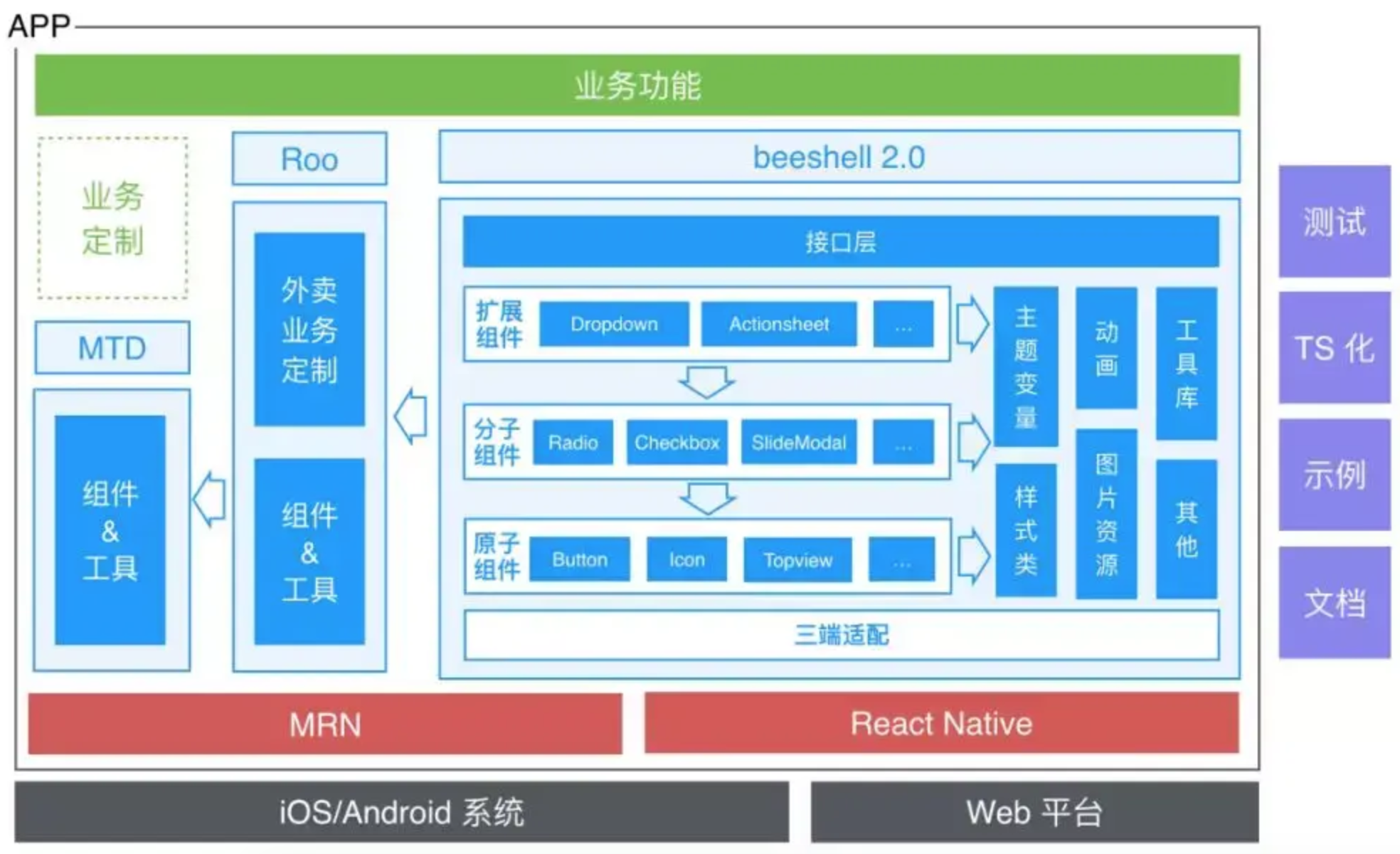 工具层。与 beeshell 1.0 相比,工具更加完备。不但新增了树形结构处理器、校验器等;而且工具的独立性更强,与组件完全解耦,与组件配合实现功能。 这样,一方面,使得组件实现更加简洁,提升了组件的可维护性;另一方面,可以将工具提供给用户,方便用户开发,提升组件库的功能性、易用性。而且,工具与组件的解耦遵循“关注度分离”的原则。 三端适配。RN 在整体上实现了跨平台,iOS、Android、Web 三端使用一套代码,但是在一些细节方面,例如:特殊 API 的支持、相对位置计算等,各个平台有较大差异。为了更好的支持三端,保证跨平台稳定性,还需要在这一层做很多适配工作。