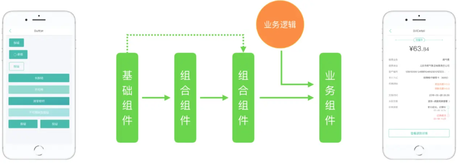 通过对功能点的梳理抽象出一个个原子单元组件,保证每个单个组件职责单一,组件对外接口一致。然后可以通过对组件进行组合,并且赋予业务逻辑形成业务组件。