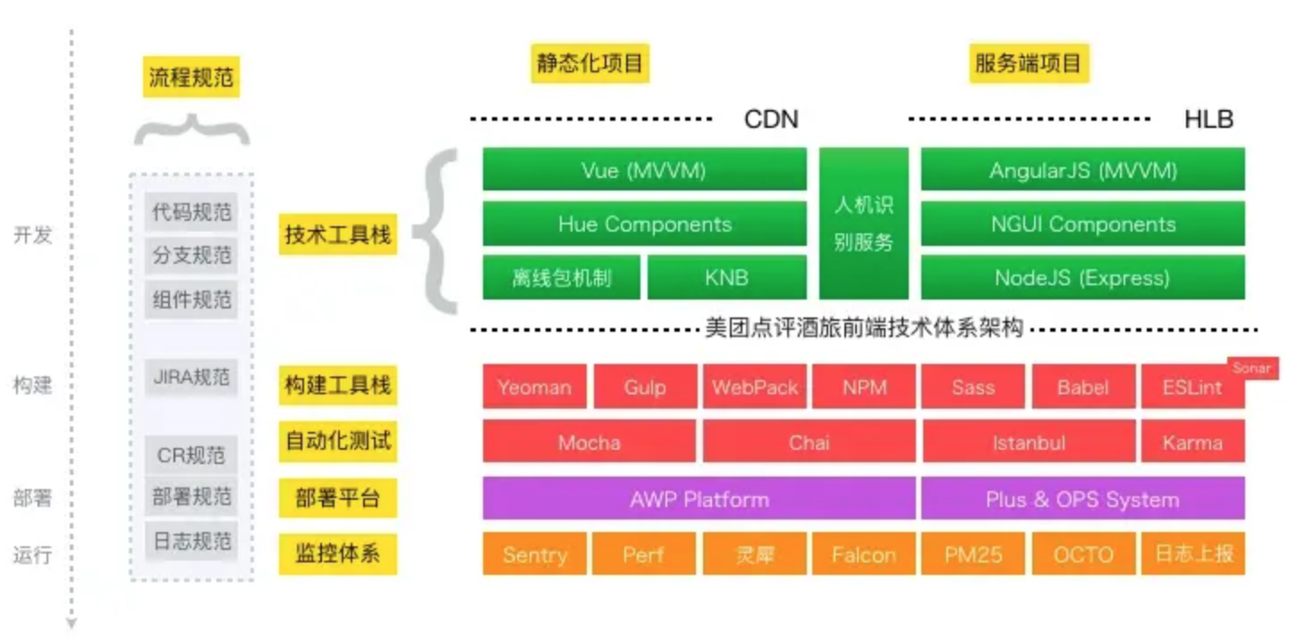 构建工具栈中我们通过Yeoman开发了团队的脚手架,开发者可以通过脚手架快速的进行项目搭建和组件开发,通过Gulp和Webpack进行项目的构建和打包,NPM作为团队统一的包管理工具,Sass作为CSS的预编译工具提升CSS代码的可维护性,Babel作为ES6的编译工具,ESLint作为团队的代码检查工具保证代码的规范一致,并且接入了Sonar。同时借助一些开源的自动化测试工具提升开发阶段的代码质量。