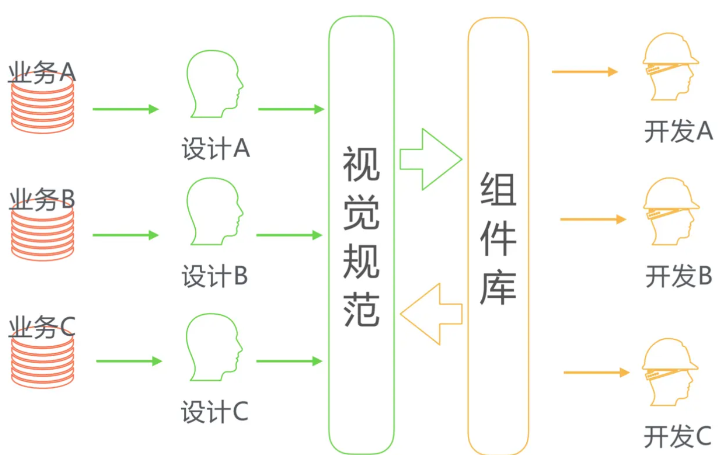 在这个阶段,不同的业务、设计团队共同合作,制定视觉规范,从而沉淀通用的组件库,这样不同业务的开发同学就能够采用组件库实现标准统一的业务样式。