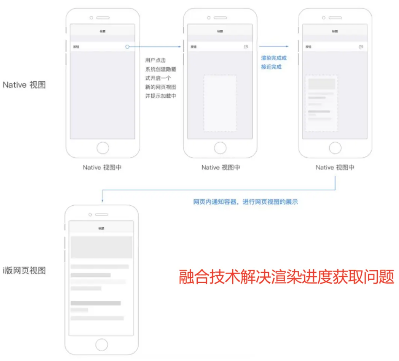 页面白屏问题,无法做到原生页面在切换时候的流畅度。白屏问题的本质原因在于原生页面切换到Web页面时候,Web页面这时候还未加载渲染完成,因此会导致白屏问题。解决方案就是在当前原生页面中通过一个不可见的webview将页面进行加载,当webview页面完全加载完成后通知原生页面然后进行跳转。