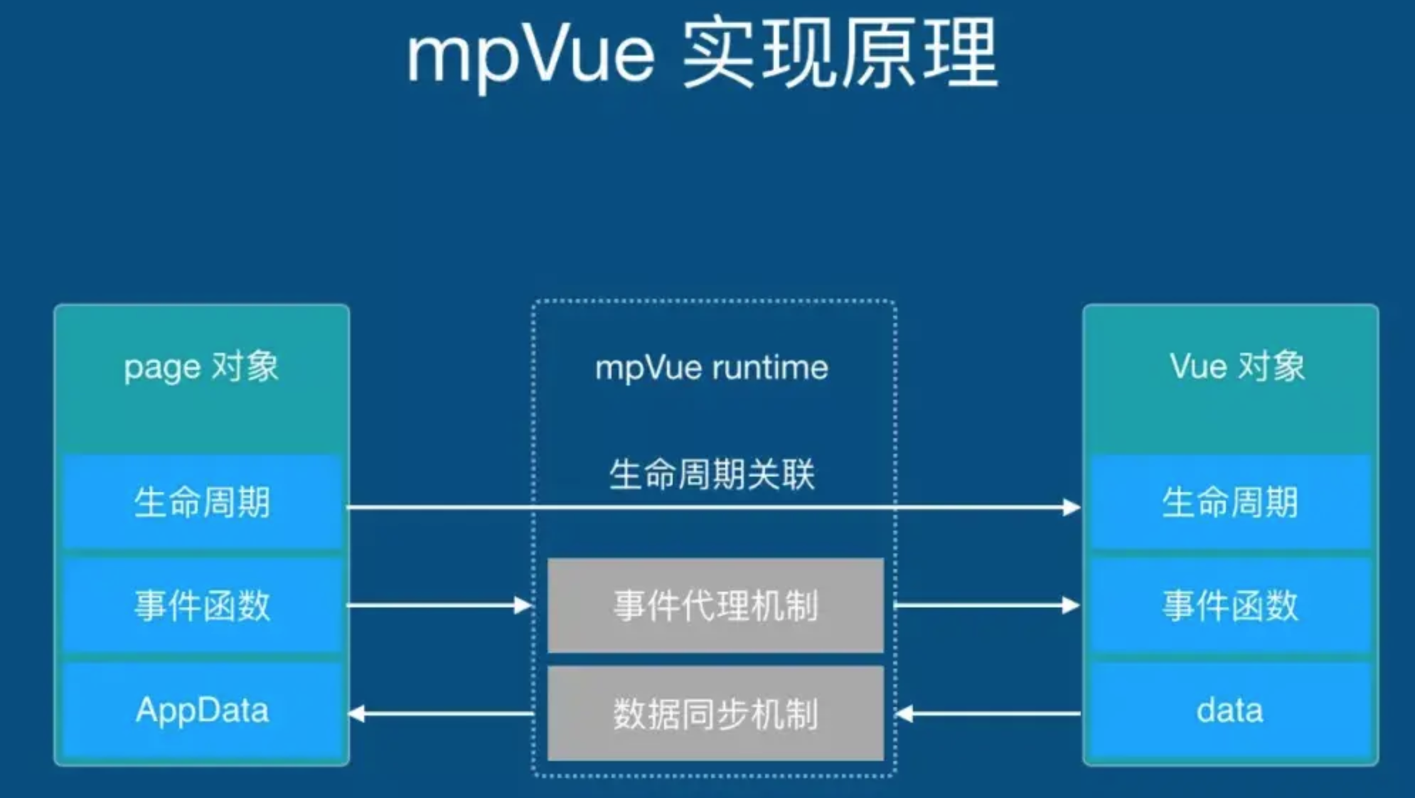 生命周期关联:生命周期和数据同步是 mpvue 框架的灵魂,Vue.js 和小程序的数据彼此隔离,各自有不同的更新机制。mpvue 从生命周期和事件回调函数切入,在 Vue.js 触发数据更新时实现数据同步。小程序通过视图层呈现给用户、通过事件响应用户交互,Vue.js 在后台维护着数据变更和逻辑。