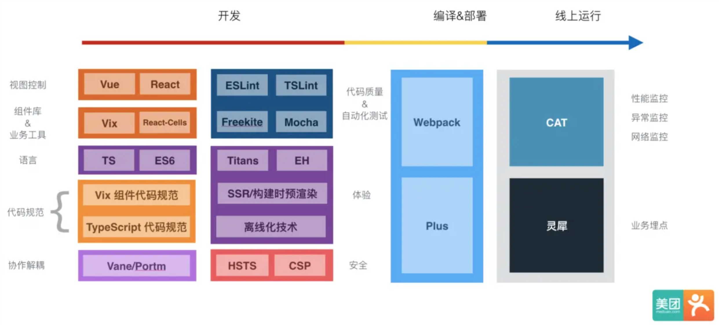 上文中已经介绍过Vix组件库和EH的Hybrid增强框架,这张图更加完整的展现了金融团队前端技术体系的全景,从开发、编译、部署到线上运行等环节。