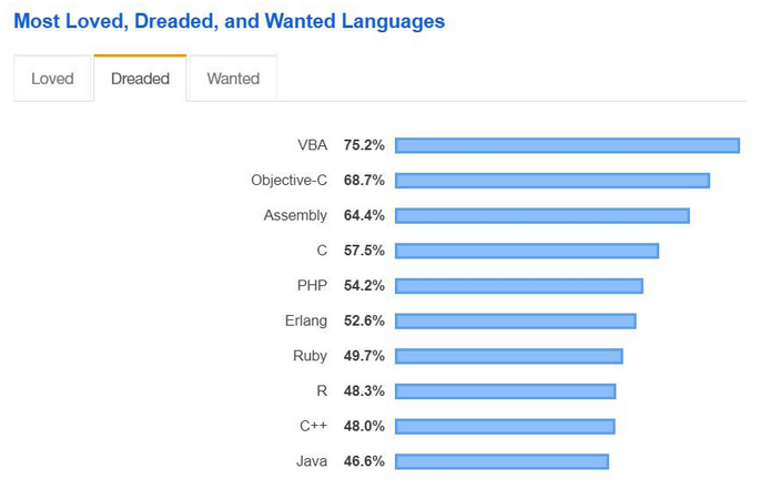 在这一点上,Python 做的很好,它在 Python 2 和 Python 3 之间做了一个明确的划分。这些语言通常提供 10 种方法来做同样的事情,而不关心开发人员用起来是否方便。根据 StackOverflow developer 的调查,大多数主流的旧编程语言都在“最可怕的语言”类别中占据了榜首: