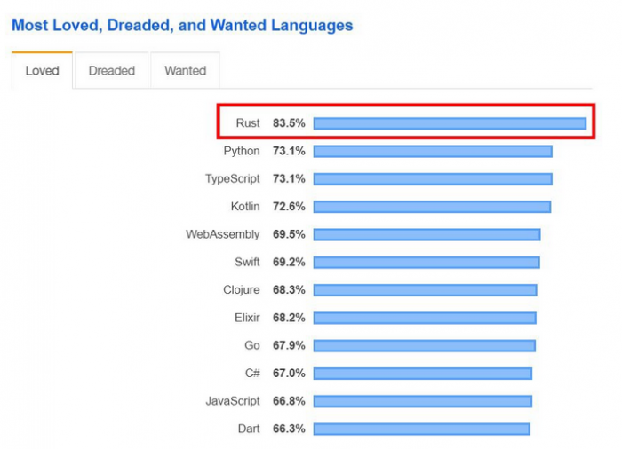 自 2015 年首次亮相以来,Rust 一直被开发者所喜爱,并在 StackOverflow 开发者调查中连续四年(2016、2017、2018、2019)被评为最受欢迎的语言: