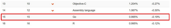 在几乎所有流行编程语言比较网站,Go 的排名很高,超过了许多现有的语言。以下是 2019 年 12 月的 TIOBE 指数评级,Go 排名第 15 位:
