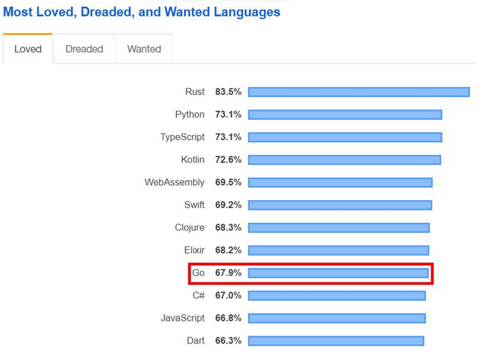 根据 Stackoverflow 的调查,Go 是十大最受欢迎的编程语言之一: