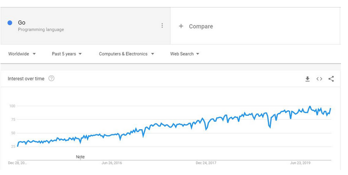 谷歌还显示,过去五年里,Go 的吸引力不断增强: