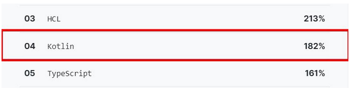 Kotlin 也是增长最快的编程语言之一,排名第四: