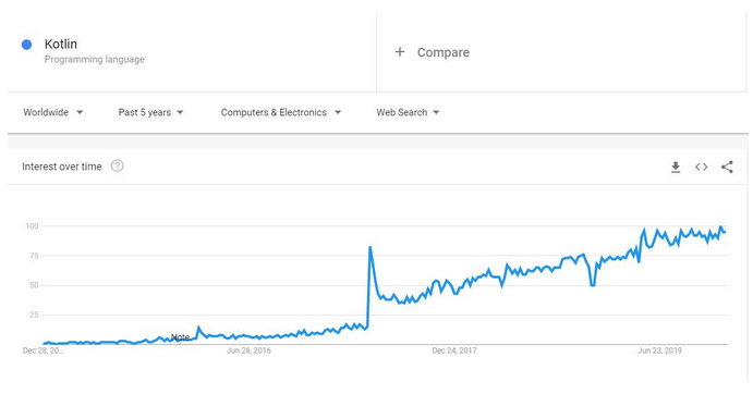 自从谷歌宣布 Kotlin 是开发 Android 应用程序的一流语言以来,Kotlin 的受欢迎程度快速上升,如下图所示:
