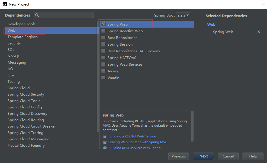 选择图中的Web项目和其子选项中的Spring Web,然后点击下一步。
