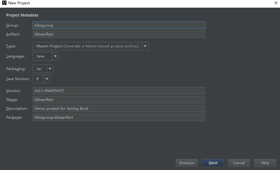 可以在图中看到,系统默认把Package赋值成了Group+Artifact的值了—kibagroup.kibaarifact。