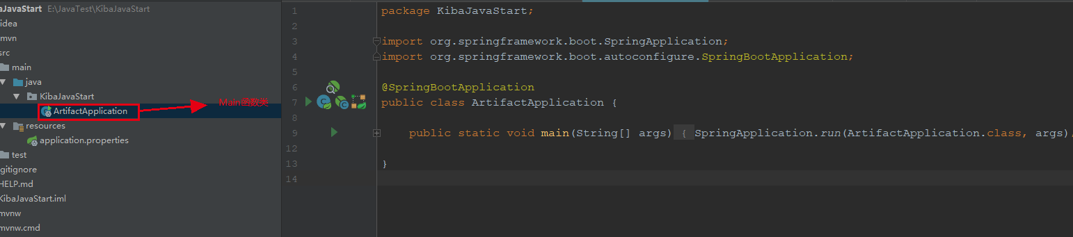 可以看到,在KibaJavaStart包下只有一个类ArtifactApplication,类里只有一个方法Main。